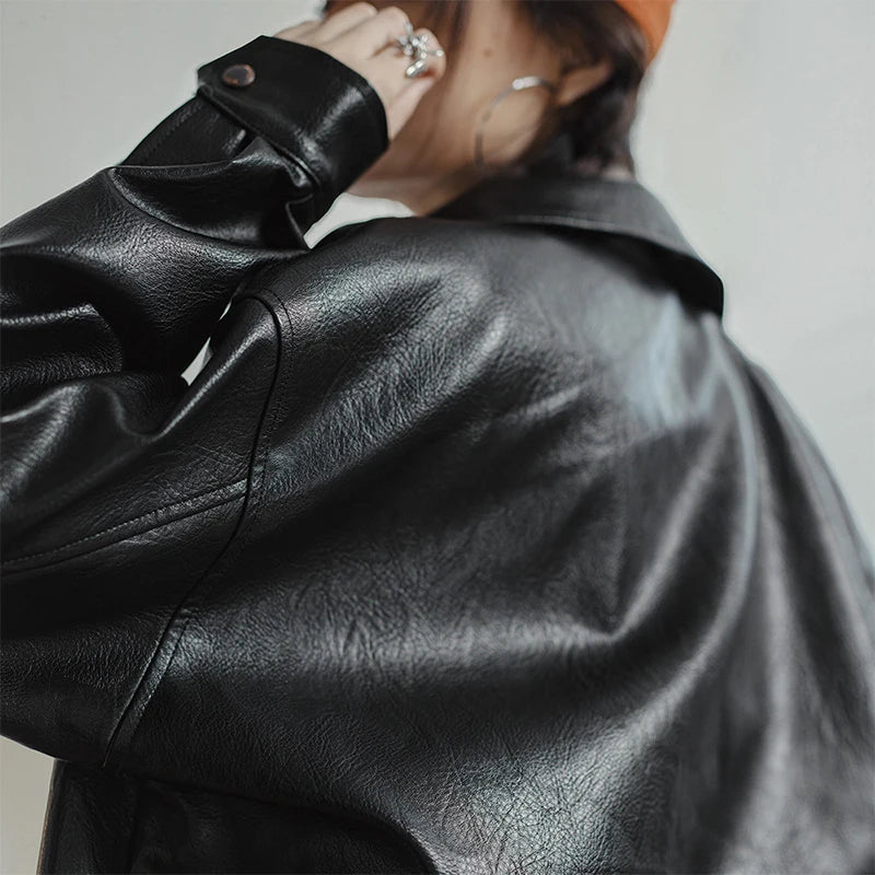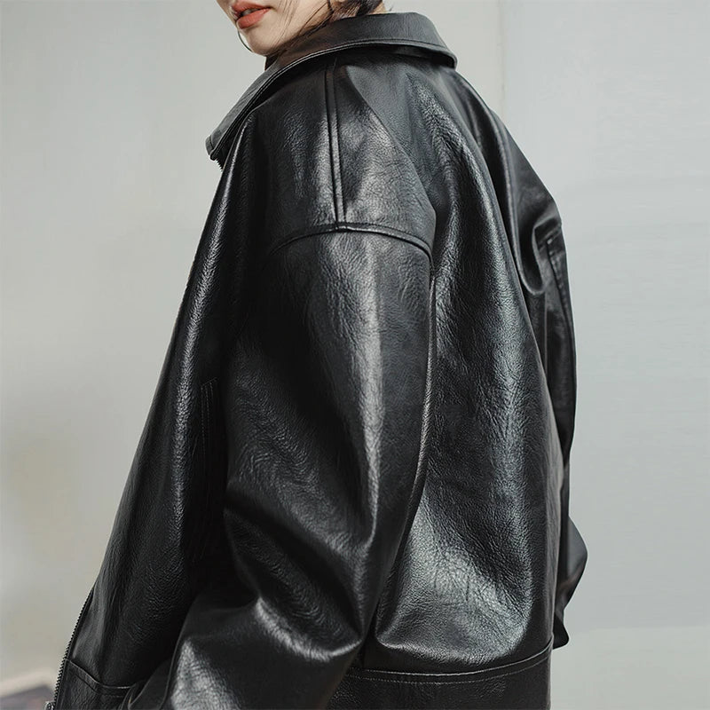 Esta chaqueta tipo biker en color negro combina diseño moderno y funcionalidad. Confeccionada en poliéster con acabado en “cuero litchi” (PU de alta calidad), ofrece una textura resistente y elegante, ideal para los días fríos de otoño e invierno. Su corte tipo moto con cuello alto, cierre metálico y botones de cobre aporta carácter y versatilidad, adaptándose con facilidad a distintos estilos y ocasiones.